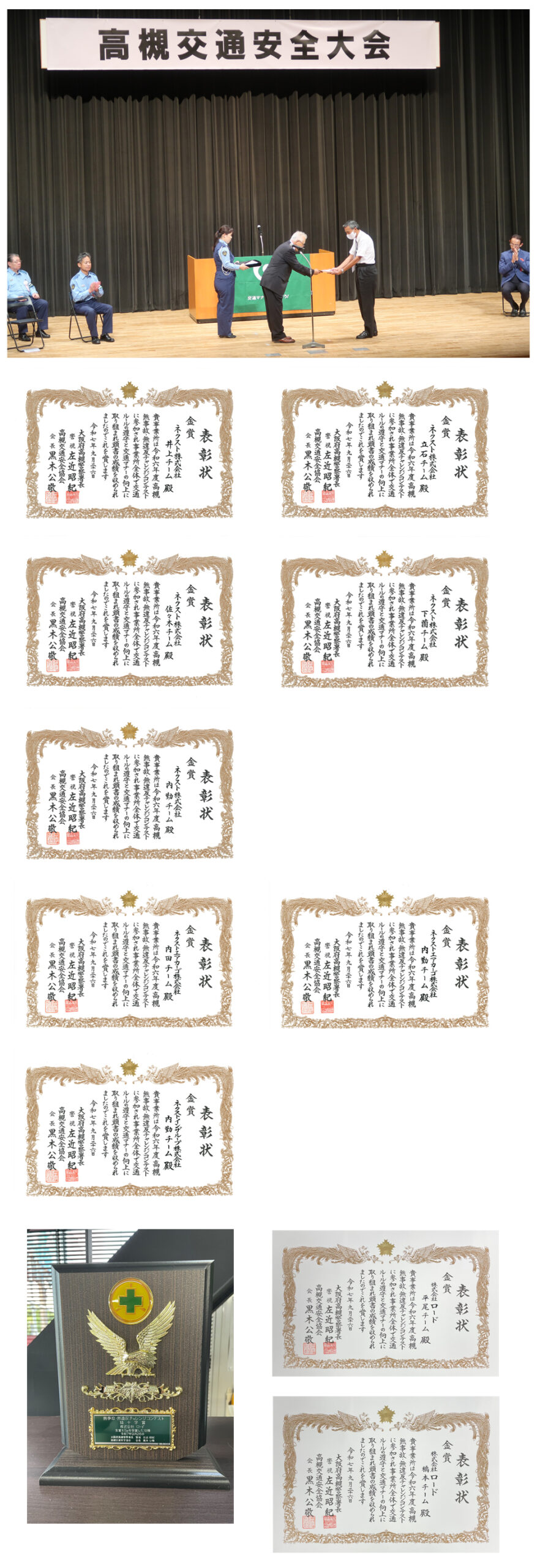 表彰式は令和7年9月26日、高槻城公園芸術文化劇場にて開催され、ネクスト株式会社・ネクストエアカーゴ株式会社・ネクストインザループ株式会社が金賞を、株式会社ロードが緑十字賞を受賞いたしました。